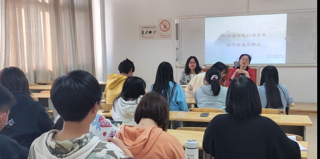 2020年11月20日下午,新葡萄88805官网日语专业在特教大楼1006教室召开教学信息反馈反馈会,新葡萄88805官网副书记刘碧芬,日语教研室主任韩琦及2018级、2020级日语本科班学生代表参加。