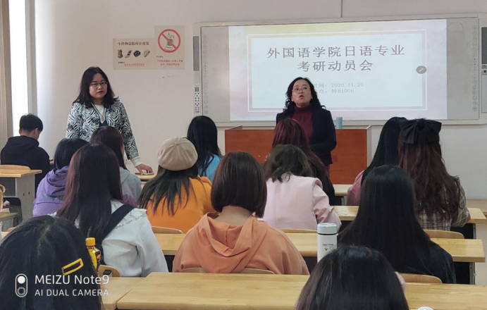 会议伊始,蒋燕院长提出了“态度决定高度”,今天的志向决定了今后的高度,希望同学们早谋划、早打算、早准备。蒋院长还为学生们分析了近几年就业形势,考研不仅是在当前较为严峻的就业形势下提升就业竞争力的途径,也是全方位提升个人能力,促进全面发展不可多得的机会。而后由日语教研室主任韩琦与同学们分享了自身的考研经历,讲述了一些考研学习方法和备考技巧,并为同学们加油打气。